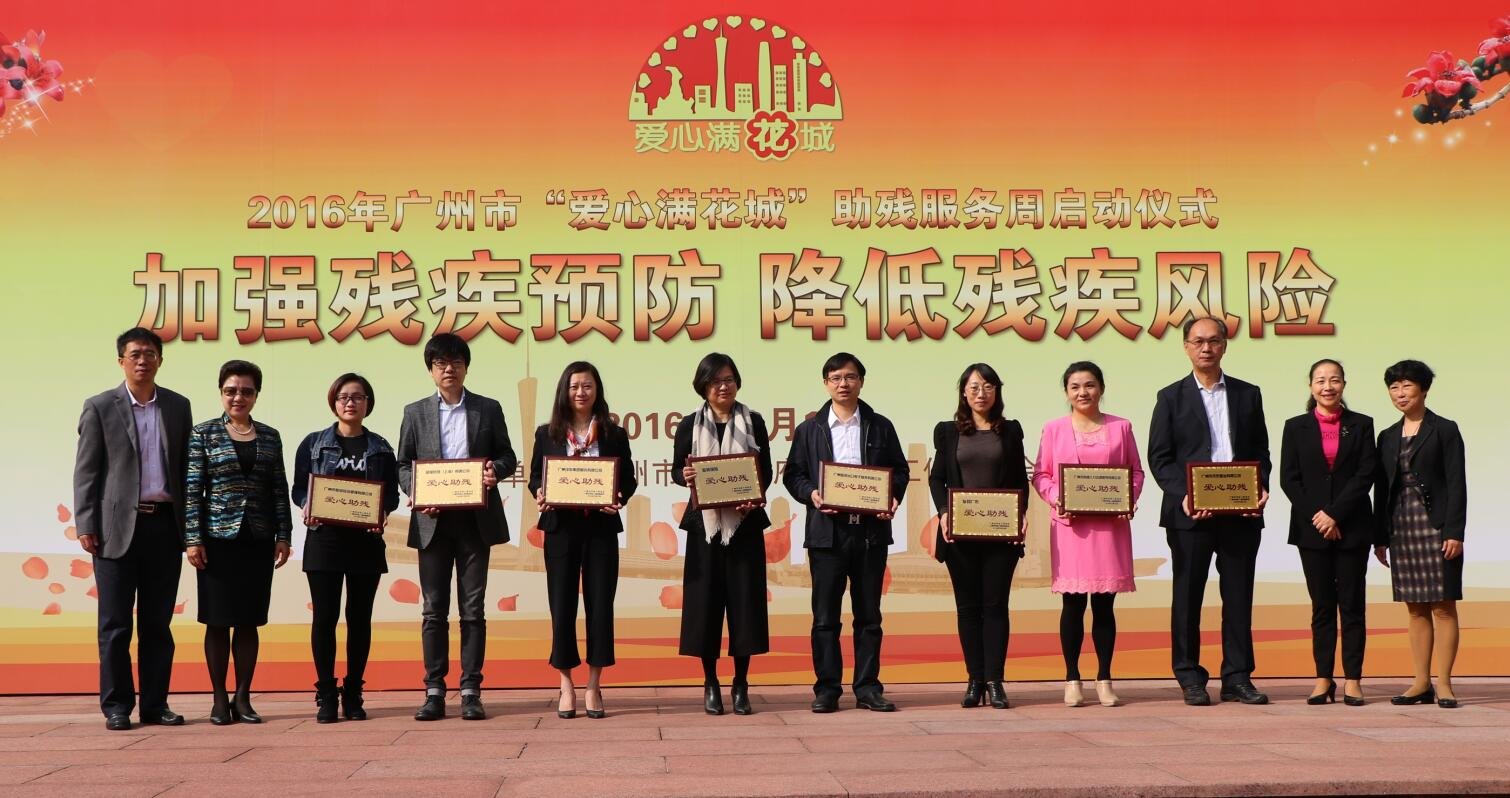 仪式上,广州市残联、广州市残疾人福利基金会向一批爱心企业授牌。广东省残联副理事长李敏(左二)、广州市残联副理事长傅蝶(右二)、张扬(右一),和广州市卫生计生委疾病控制处主任周端华(左一),为广州圆进出口电子商务有限公司、友邦保险、友邦广东、广州汽车集团股份有限公司、广州市利源人力资源服务有限公司、邑隆贸易(上海)有限公司、广州市磐信投资管理有限公司、广州市禾泰置业有限公司的代表颁授“爱心助残”牌匾。