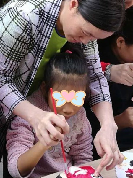 在绘制脸谱之前,荔湾民协的画作老师耐心地为孩子和家长们涂色的方式。同时引导普通的孩子和家长们在绘制脸谱前,拉着视障孩子的手,一同触摸脸谱的形状,让他们感受脸谱的模样。在绘制过程中,老师还会下场指导孩子们完善他们的脸谱。