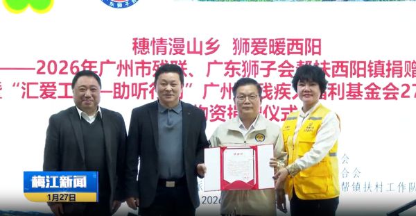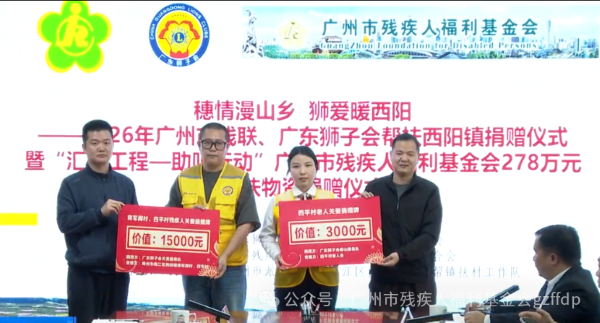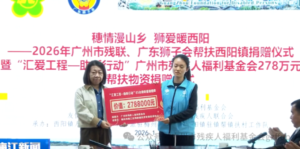 2026年1月26日,“穗情漫山乡 狮爱暖西阳”帮扶捐赠仪式在西阳镇政府举行,广州市残联、广东狮子会及广州市残疾人福利基金会联合向西阳镇移交总价值290万元的帮扶物资,涵盖278万元助听器及12万元桥梁、路灯等实物捐赠及助残尊老慰问,精准对接乡村民生需求,让爱心切实惠及西阳镇群众。