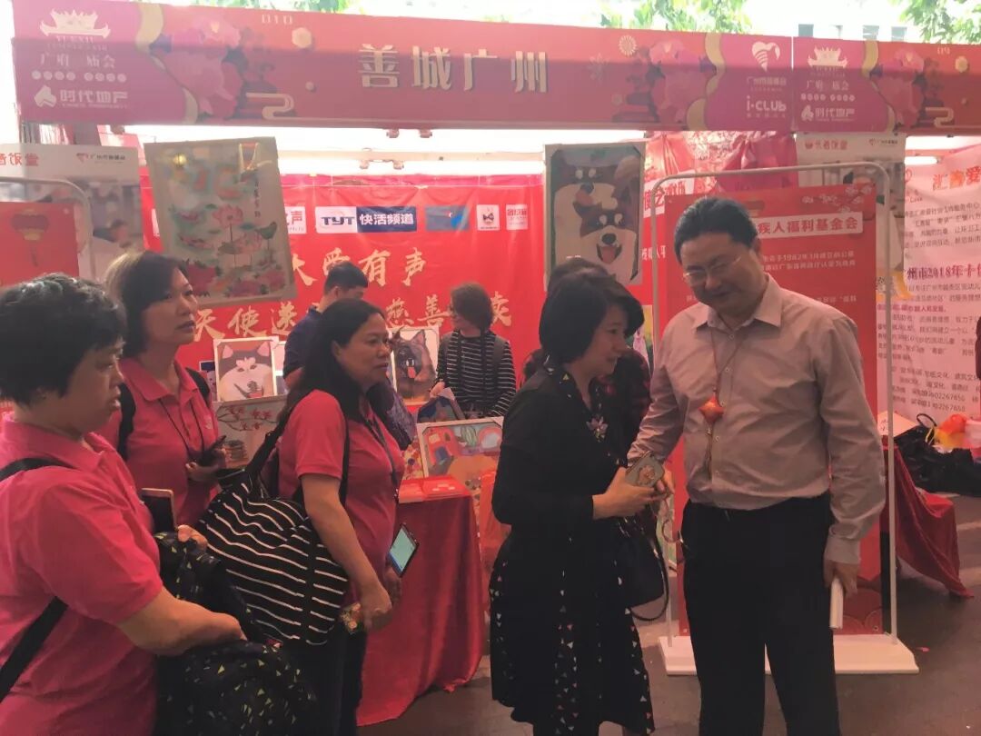 广州市慈善会秘书长汪中芳(右一)莅临追梦天使的义卖现场指导,与广州市残疾人福利基金秘书长伍智敏(右二)交谈