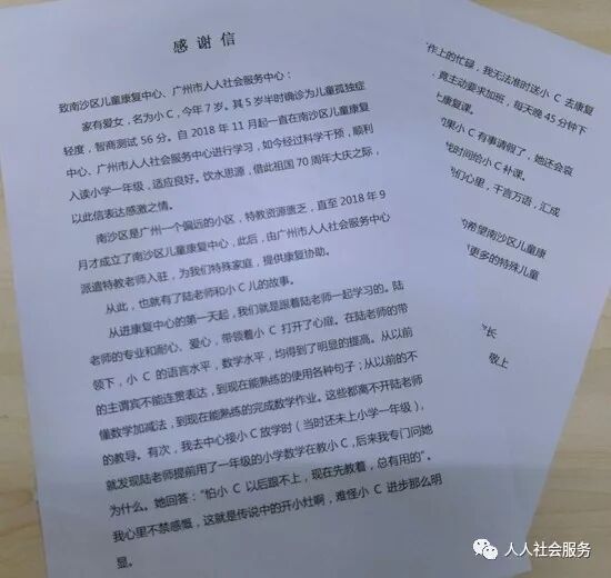 家有爱女,名为小C,今年7岁。其5岁半时确诊为儿童孤独症轻度,智商测试56分。自2018年11月起一直在南沙区儿童康复中心、广州市人人社会服务中心进行学习,如今经过科学干预,顺利入读小学一年级,适应良好。饮水思源,借此祖国70周年大庆之际,以此信表达感激之情。
