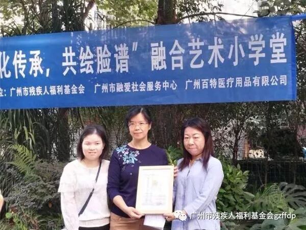 广州市残疾人福利基金会副秘书长古丽(右)与广州市融爱社会服务中心总干事张倩昕(左)向广州百特医疗用品有限公司高级人事经理刘敏(中)授予感谢证书